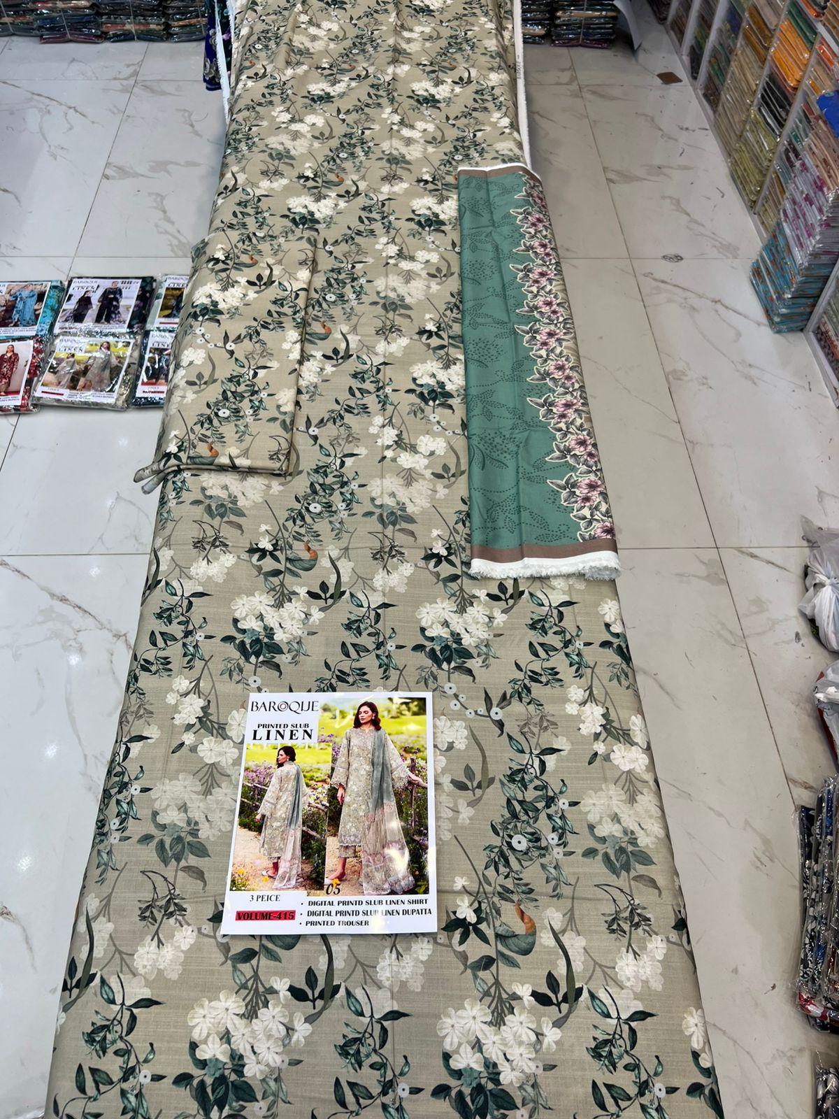 415-Volume Baroque Printed Slub Linen 3 Pc Suit Women Collection Design No 5