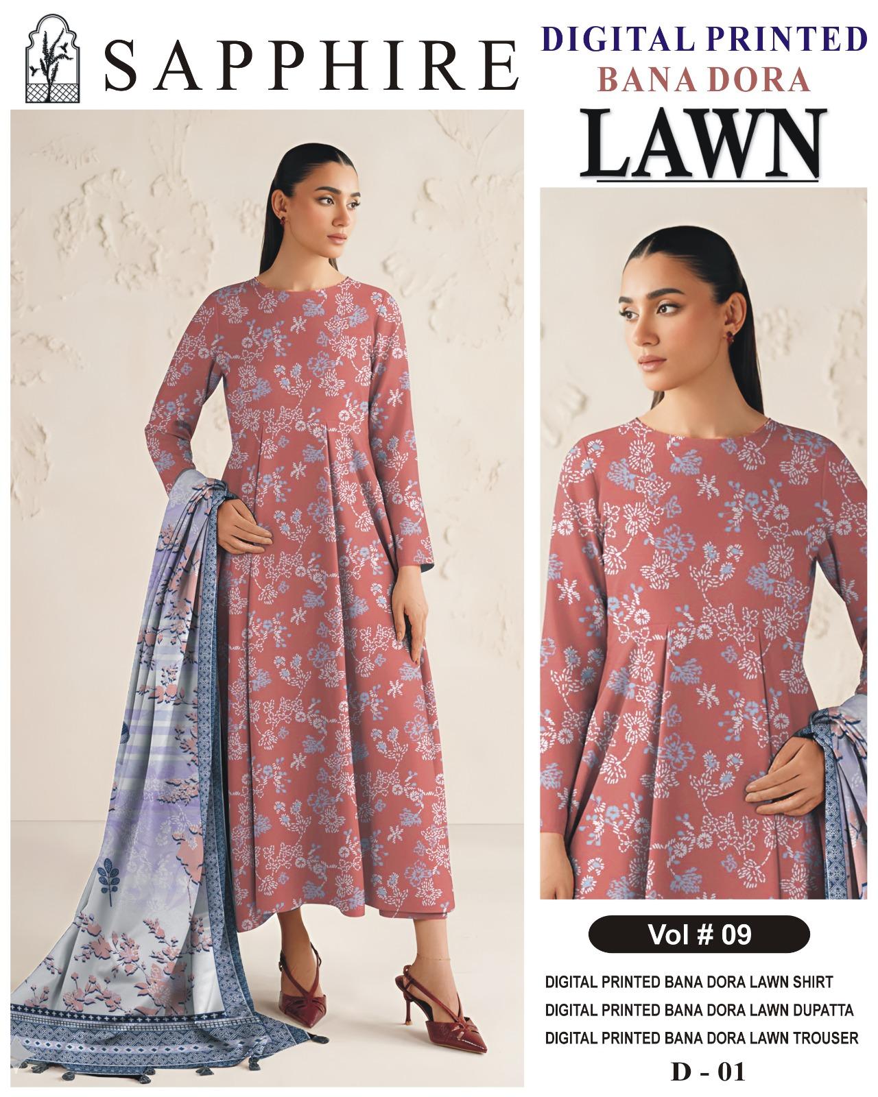 Vol-09 Sapphire Digital Printed Bana Dora Lawn 3pc Dresses – Women Wear Design No. 1