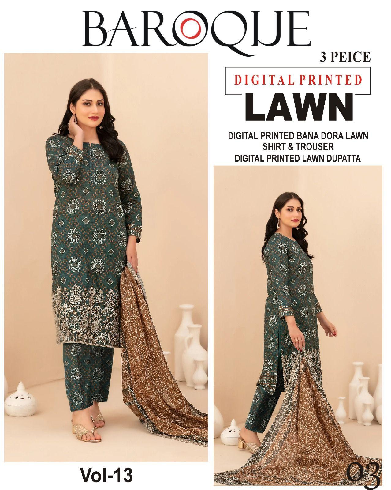 Vol-13 Baroque Digital Printed Bana Dora Lawn 3pc Dresses- Women Wear Design No. 3