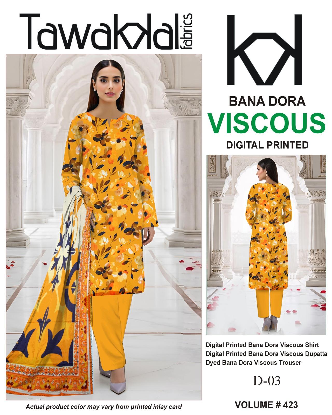 Vol- 423 Tawakkal Printed Bana Dora Viscose 3pc Dresses – Women Wear Design No. 3